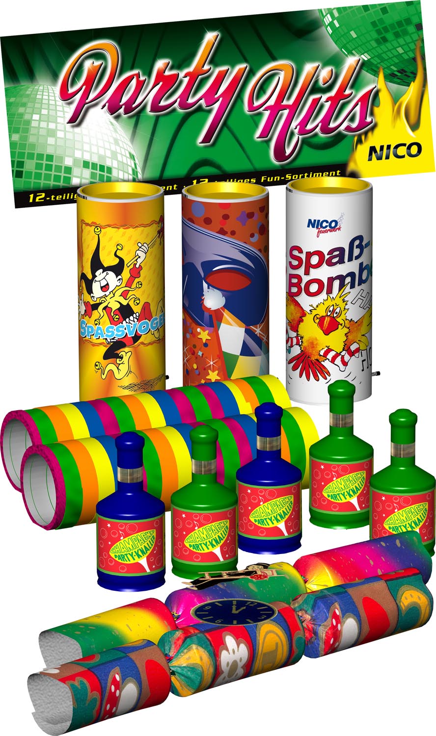 Das Mega Fun Sortiment es besteht aus 3 Tischbomben, 2 Knallbonbons, 5 Champagner- Party-Knaller und 2 Rollen Luftschlangen.